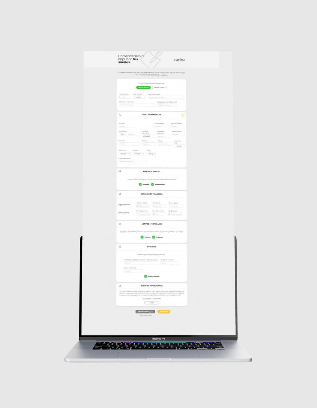 Nosotros, desde el ámbito digital, impulsamos a vanka a ser una Fintech en el país. Desde la generación de un sitio web hasta un sistema robusto de gestión de créditos. Estas imágenes muestran el formulario de solicitud de crédito desde los usuarios. Diseñamos una interfaz y experiencia de usuario cómoda, ágil y simplificada; facilitando su uso y haciendo de la solicitud de créditos un paso fácil en el proceso.
